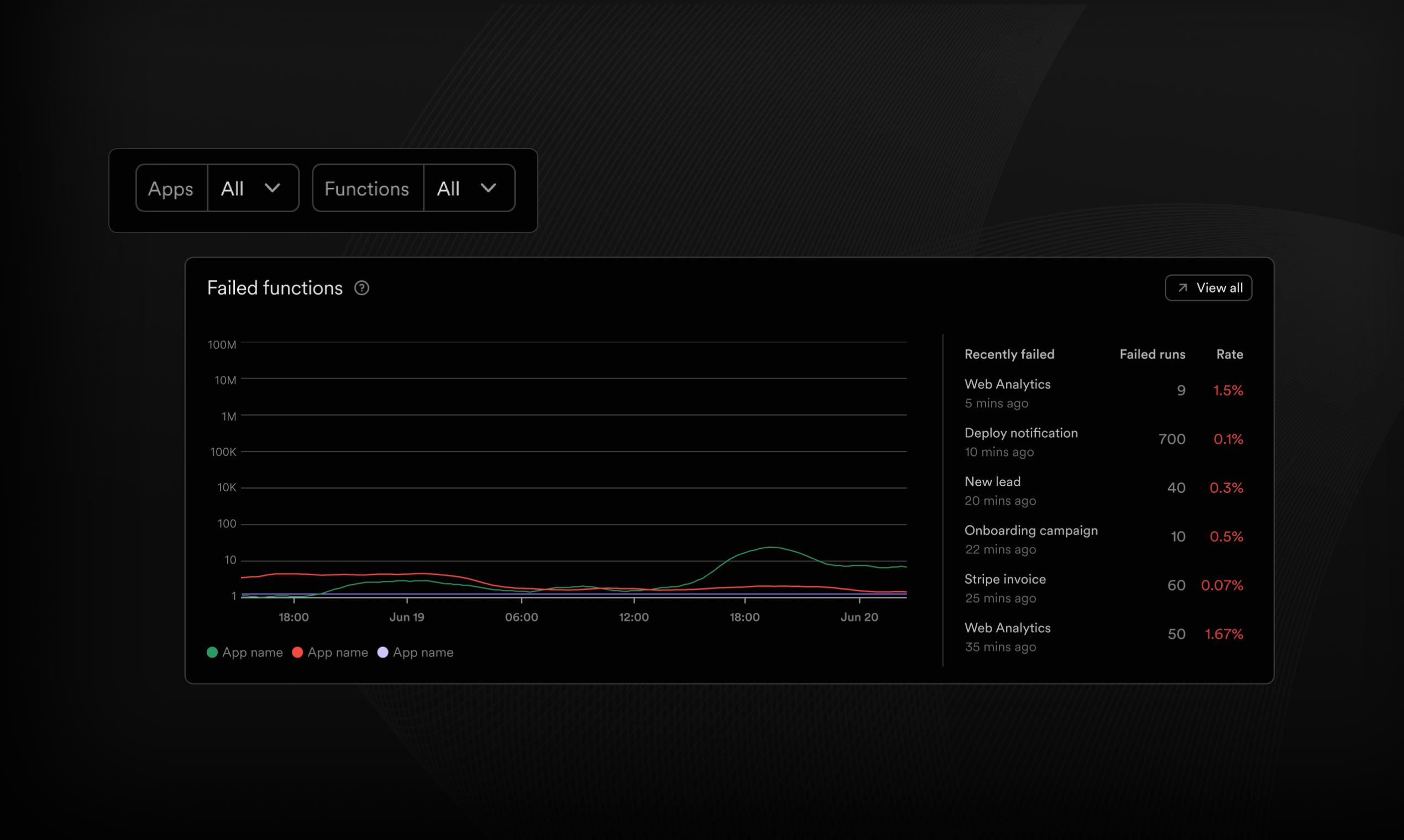 While Inngest has long offered function-level metrics, many users expressed the need for a higher-level view—one that provides a comprehensive snapshot of the entire application. With this release, we're introducing dashboard monitoring capabilities that offer a bird's-eye view of your system's health.